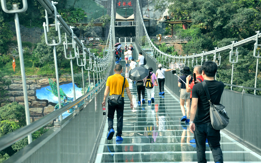 兩小時的小北江之游,大家都還余味未盡。導游又帶上大家趕往這次團建活動的重頭戲的目的地:古龍峽的“云天波霸”。今天公司參加團建的所有員工都要挑戰(zhàn)目前世界上較寬的高空玻璃橋,玻璃橋像一條通體透明的巨龍連接著峽谷兩岸,橋下懸空超過100米,站在橋上向下看,真是令人心驚膽戰(zhàn),大家相互鼓勵,三三兩兩牽手前行,用相互的關愛順利通過并成功抵達世界較大直徑的懸空玻璃平臺。盡管大家都汗流浹背,但每個人臉上都洋溢著喜悅。因為此時大家都收獲了克服恐懼心理后戰(zhàn)勝困難的勇氣和成功!