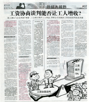 7月14日,《南方日?qǐng)?bào)》以《工資協(xié)商談判能否讓工人增收?——國研公司實(shí)踐的工資協(xié)商談判或是突破》為題,用三分之二大版篇幅報(bào)道廣州市國研機(jī)械設(shè)備制造有限公司實(shí)踐工資集體協(xié)商的成功經(jīng)驗(yàn)。