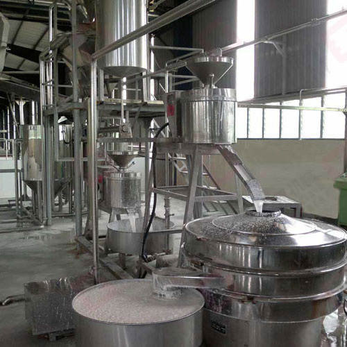大米→射流提升→除砂→洗米、浸米→瀝水→定量輸送→破碎→旋風(fēng)分離→出料→加水及輔料混和→提升→儲(chǔ)料→自動(dòng)定量喂料→自熟→擠絲→自動(dòng)切斷、上掛→連續(xù)吊掛老化→蒸粉→二次吊掛老化→松絲→連續(xù)吊掛干燥→自動(dòng)切斷→成品