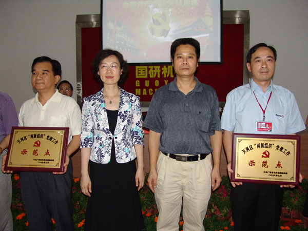 區(qū)委常委、組織部部長(zhǎng)潘文捷、廣州市組織部處長(zhǎng)邱培潘為國(guó)研機(jī)械授予黨建示范點(diǎn)匾牌并合影