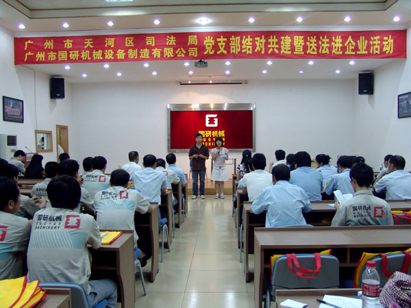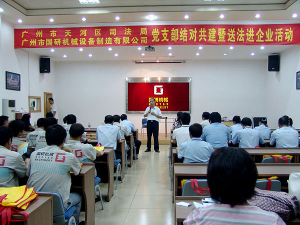 9月7日下午,廣州市天河區(qū)司法局黨支部和文教工作隊(duì)一行18人在局長(zhǎng)羅育輝和副局長(zhǎng)曾曉云的帶領(lǐng)下,來到廣州市國(guó)研機(jī)械設(shè)備制造有限公司舉行黨支部結(jié)對(duì)共建暨送法進(jìn)企業(yè)活動(dòng)。