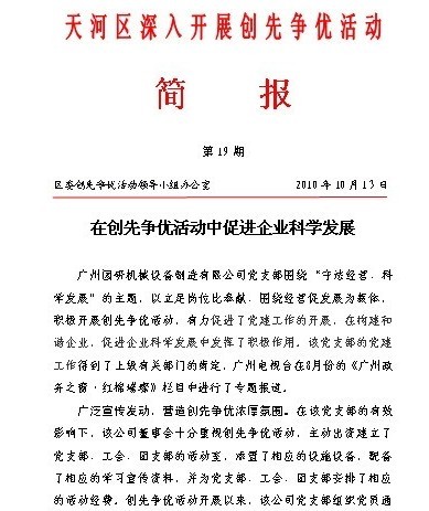 2010年10月13日,天河區(qū)區(qū)委區(qū)政府主辦的工作簡報第19期專題報道了我司黨支部在創(chuàng)先爭優(yōu)活動中促進企業(yè)科學(xué)發(fā)展的事跡。