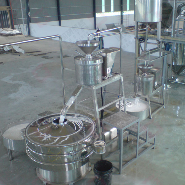 大米→射流提升→除砂→洗米、浸米→濾水→磨漿→壓濾脫水→碎粉→高溫?cái)嚢琛鷶D片→擠絲→蒸熟→老化→切斷→松絲→洗粉→濾水→定量→干燥→成品