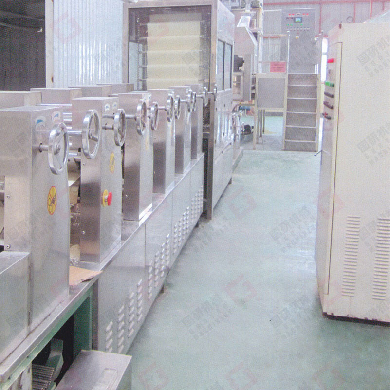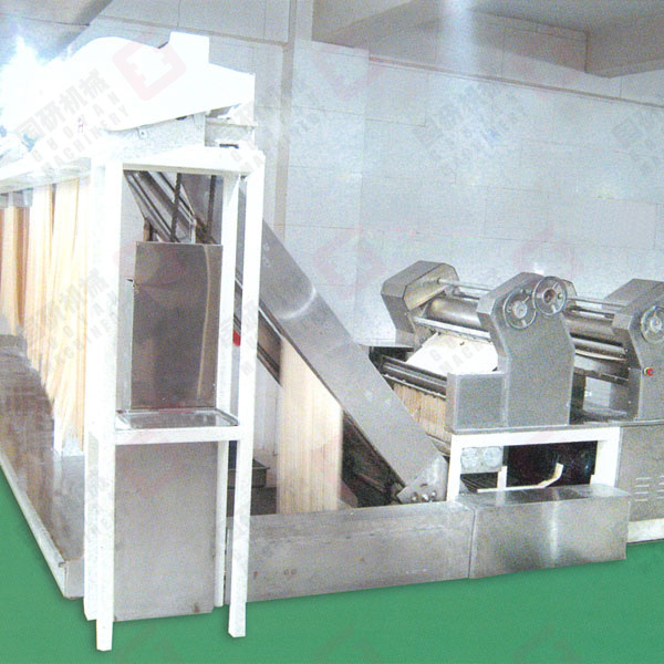 熟化機、壓延機、連續(xù)壓片機、切條機、給桿掛條機,五部分連為一組,完成面條的成型階段。攪拌和好的松散面粉經(jīng)~10分種熟化,使面粉充分吸水、嘭化形成濕面筋網(wǎng)絡(luò),送入復(fù)合機同時制成兩片面片,合壓成一片,然后經(jīng)六至七對輥壓延,以不破壞面筋組織的壓延比壓制出厚0.8~2毫米的面片。壓好的面片經(jīng)過切面刀,按不同規(guī)格切成0.8~6毫米的濕面條。由自動給桿機把切成2400-2600毫米長的面條經(jīng)掛條機送到平行鏈架,采用光電或接近關(guān)電器控制,同步地掛在烘干裝置的吊架上。尾端剪齊機裝在預(yù)干的出發(fā)點上。